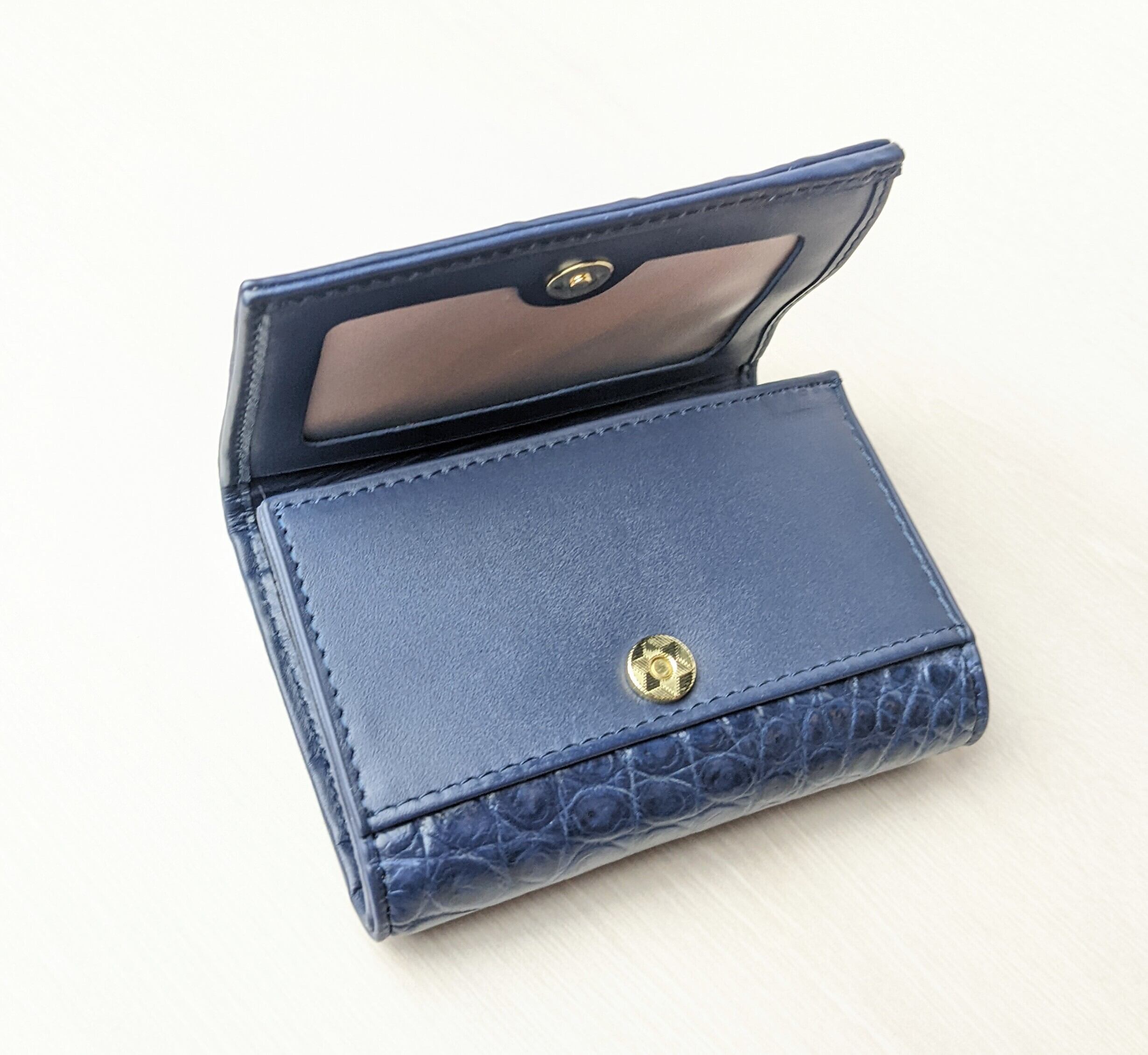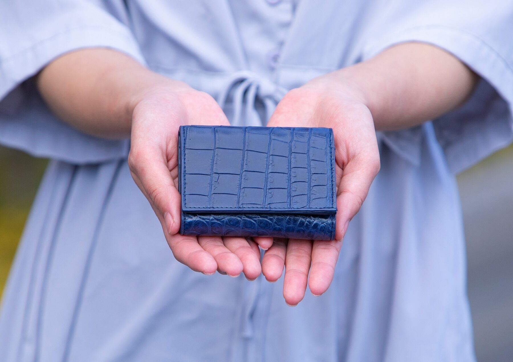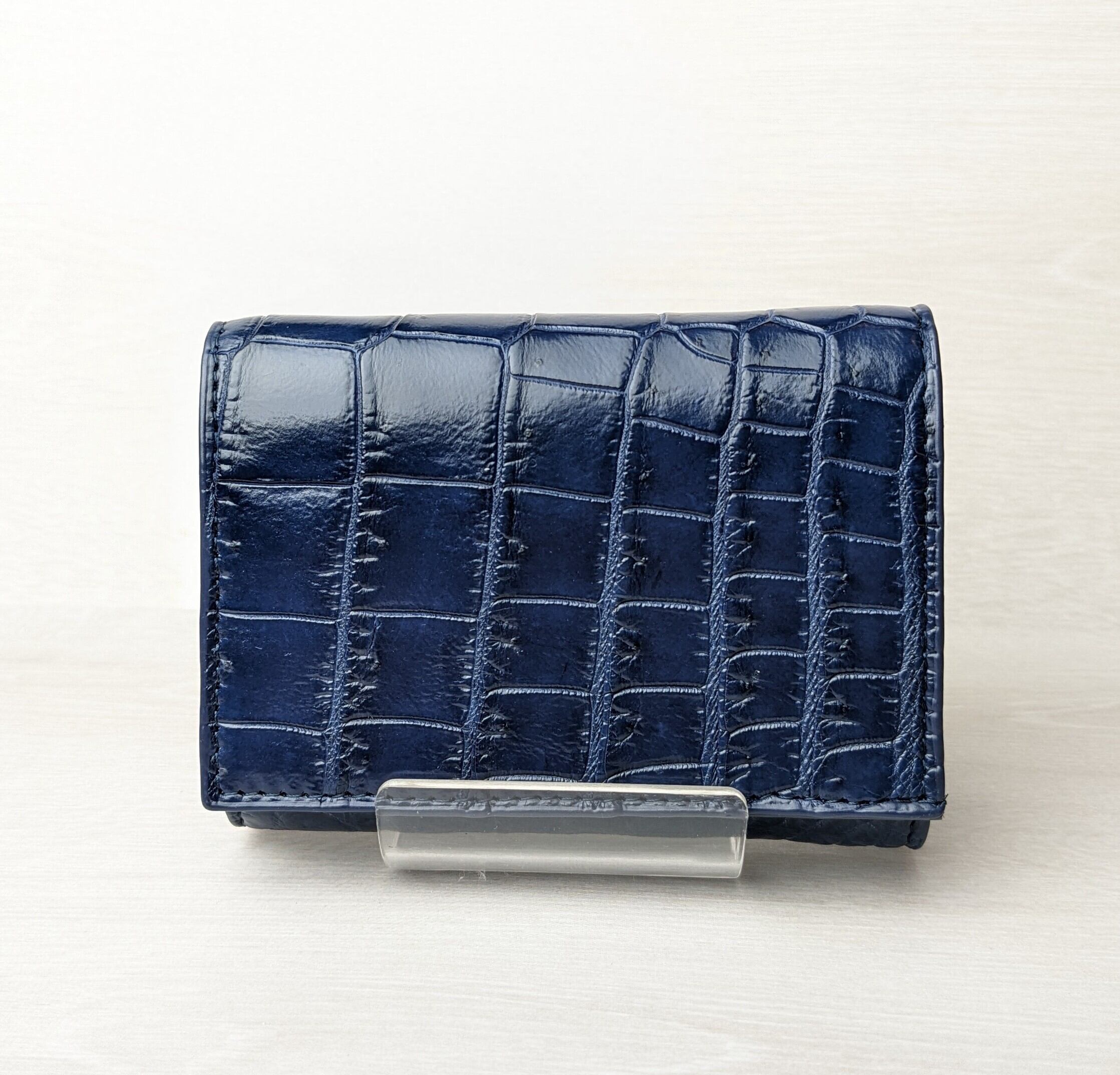 定番色では物足りないあなたへ【知的なネイビーで差がつく】クロコダイル 三つ折り財布 |ミニ財布 メンズ コンパクト 高級 本革 鰐革 職人 ハンドメイド 本物保証 ビジネス 小さい財布 レディース ギフト プレゼント 個性派 10000098