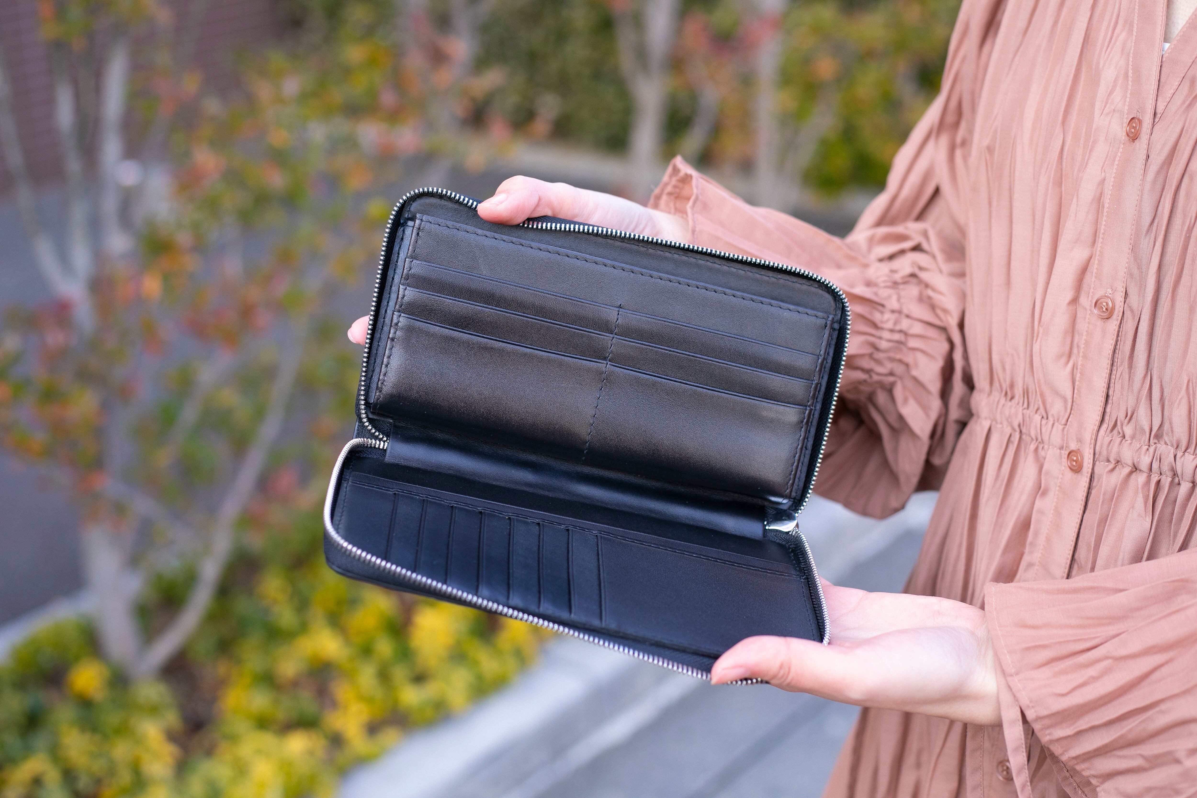 ラウンドファスナータイプの長財布はカードやお札の収納が沢山あり機能性、視認性に優れ、カジュアルからフォーマルまでスタイルを選ばずメンズ、レディースともにお勧めです。